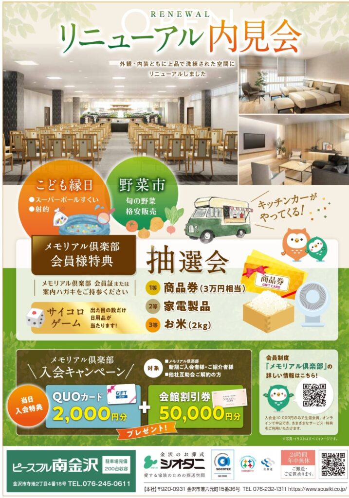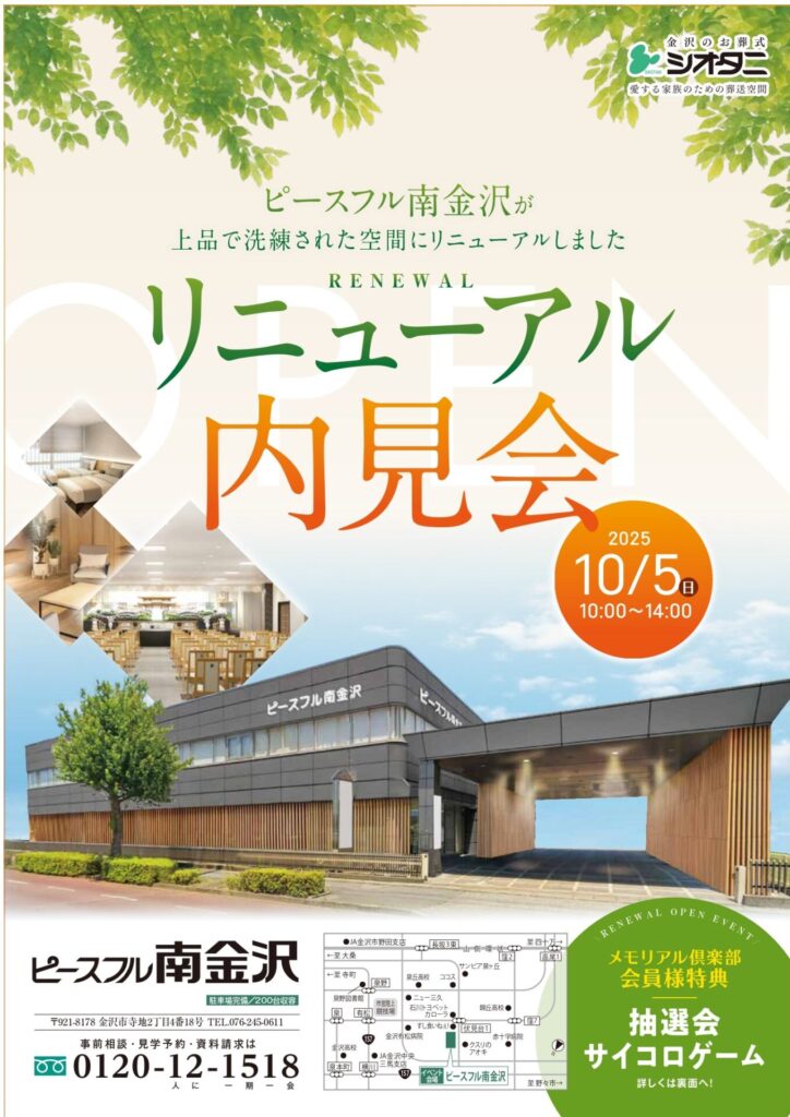 【公式】金沢のお葬式シオタニ|市内で一番多い葬儀式場 > お知らせ > イベント > ピースフル南金沢リニューアル内見会開催のお知らせ