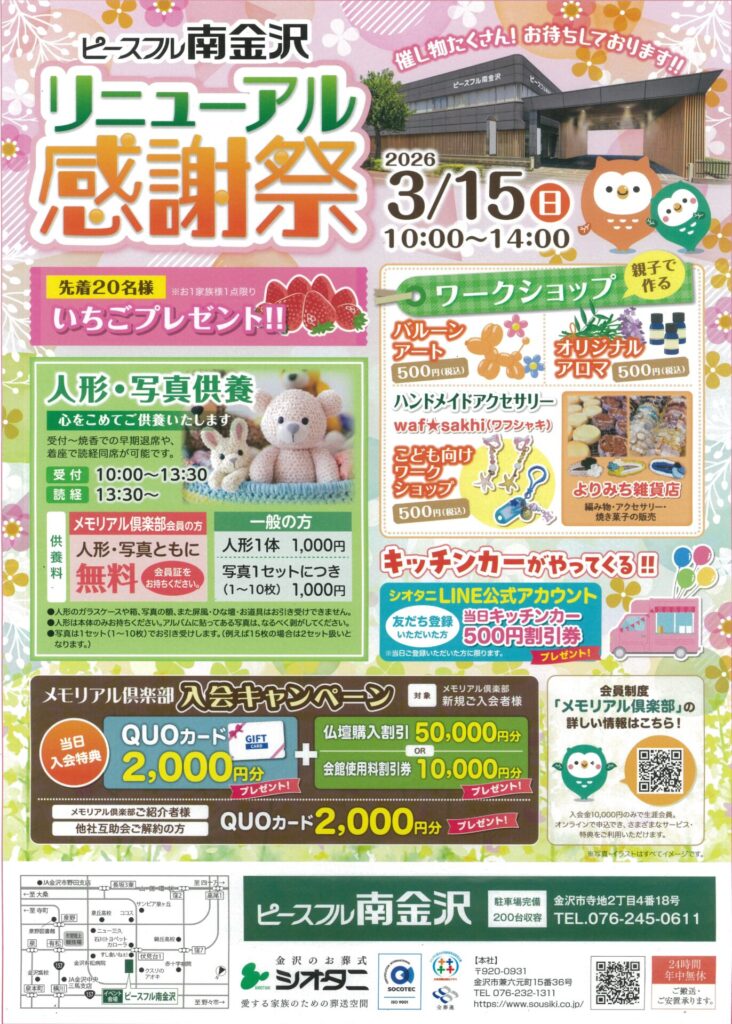 【公式】金沢のお葬式シオタニ|市内で一番多い葬儀式場 > お知らせ > イベント > ピースフル南金沢リニューアル感謝祭 開催のお知らせ